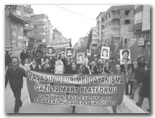 Gazi Eski Karakol’un önünde saat 10.00’da toplanmaya başlayan kitle saat 11.00’de sloganlarla yürüyüşe geçti. En önde ortak “Yaşasın devrimci dayanışma!/Gazi 12 Mart Platformu (Alınteri, BDSP, DHP, DTP, ESP, Mücadele Birliği, Partizan)” pankartını taşıyan 60 kişilik bir kitlenin arkasından sırayla; ESP “Adalet.. Adalet.. Adalet... Katiller yargılansın!”, DHP “Gazi, Sivas Çorum, Maraş son değil devlet katliamı sürüyor!”, Özgür Demokratik Alevi Hareketi “Gazi ve Ümraniye katliamlarını unutmadık, unutturmayacağız!”, DTP “Gazi, Maraş, Halepçe ve İran’daki katliamları kınıyoruz!”, Mücadele Birliği Platformu “Yaşasın Gazi ayaklanması!”, Partizan “Gazi’nin, Çorum’un, Sivas’ın, Maraş’ın katili patron-ağa devletidir!”, Alınteri “Taş, yürek, barikat, yaşasın Gazi direnişimiz!”, DİP, TÖP, KÖZ, PDD, Kaldıraç ve Halkevleri de pankart ve flamalar taşıyarak, sloganlarla yürüdüler.